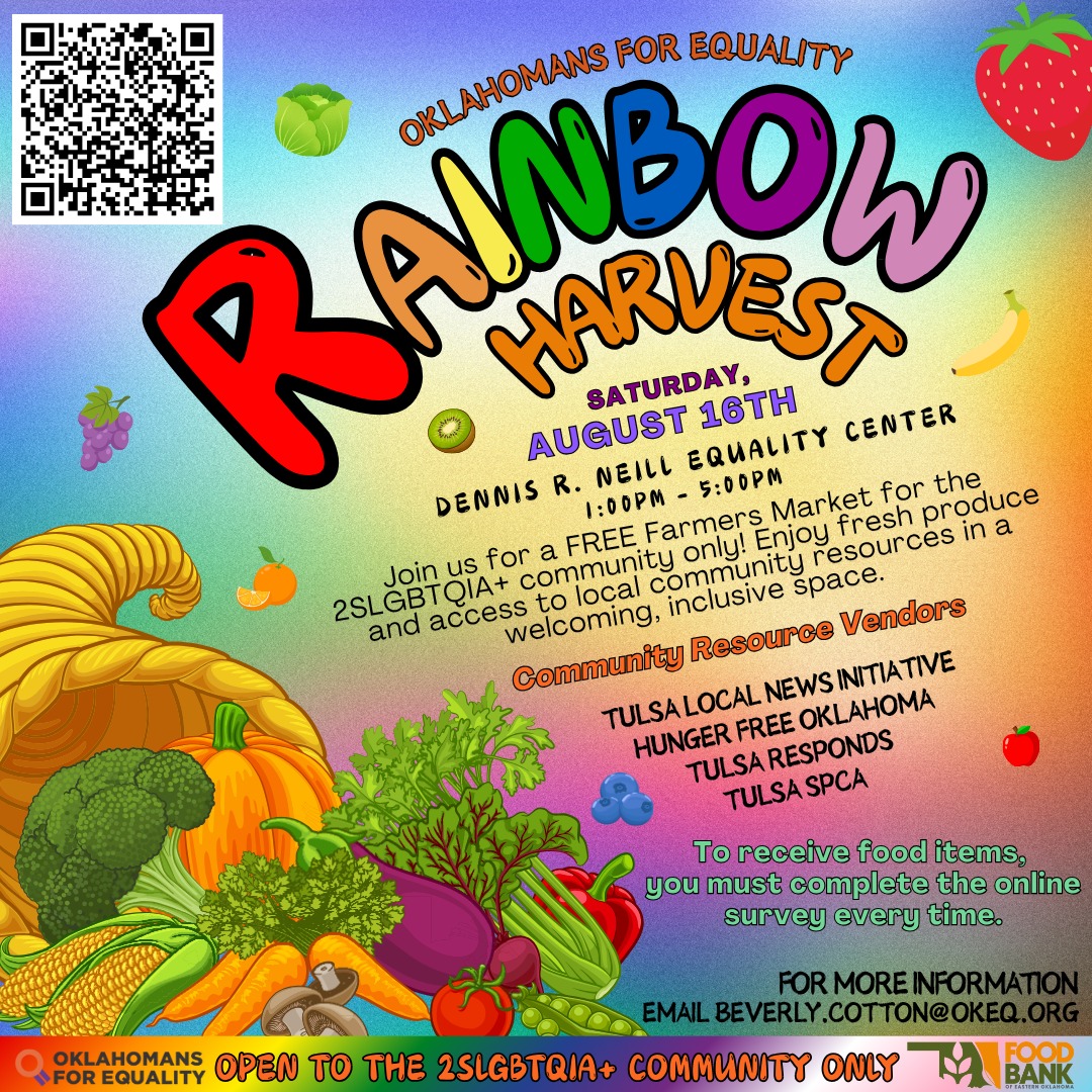 Food is not a luxury, it’s a right. In partnership with the Eastern Oklahoma Food Bank, Rainbow Harvest exists to make sure that no one in our community goes without nourishment or support. Whether you’re picking up groceries, learning about local services, or simply coming to be with chosen family, you are welcome here.