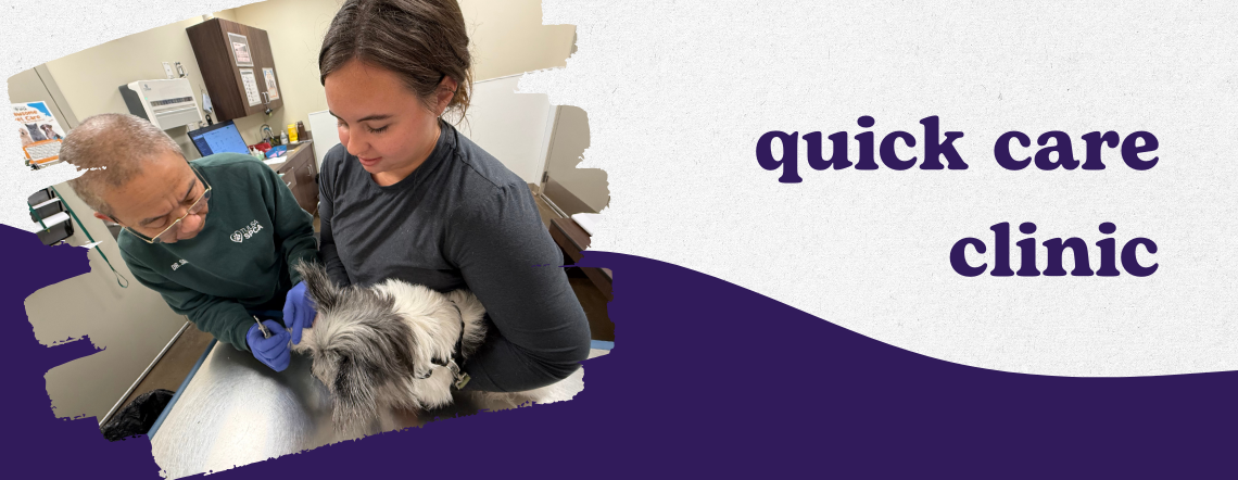 Quick Care Clinic is open for walk-in visits only, operating Wednesday afternoons from 1:30–3:30 PM. The clinic is closed to the public on the first Wednesday of each month. Services are administered by trained veterinary assistants and are intended for basic care only—not for illness or injury.